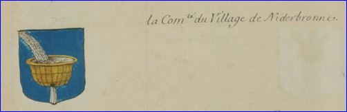 D'azur au bassin d'or, dans lequel tombe un jet d'eau argent jaillissant d'une nuée du même mouvant de l'angle dextre du chef, dont l'eau du même s'écoule en pointe par une ouverture au bas du bassin.
