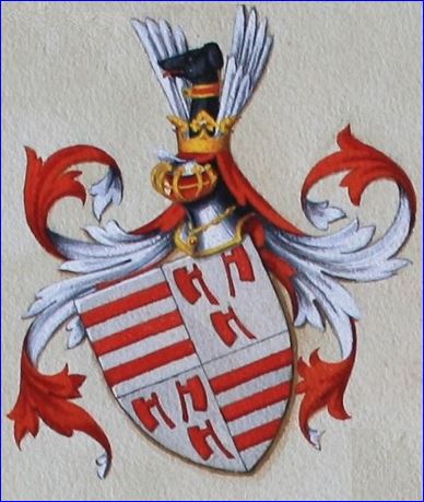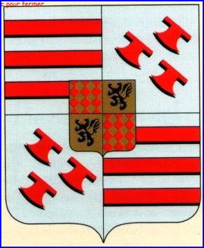 Écartelé: aux 1er et 4e d'argent à trois fasces de gueules, aux 2e et 3e d'argent à trois doloires de gueules; sur le tout,écartelé aux I et IV losangé d'or et de gueules, aux II et III d'or au lion de sable.