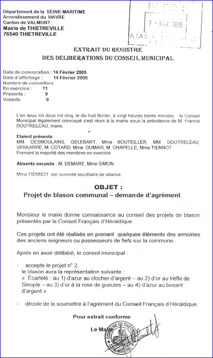 (2005) Écartelé: au 1er d'azur au clocher d'argent, au 2e d'or au trèfle de sinople, au 3e d'or à la rose de gueules, au 4e d'azur au besant d'argent.