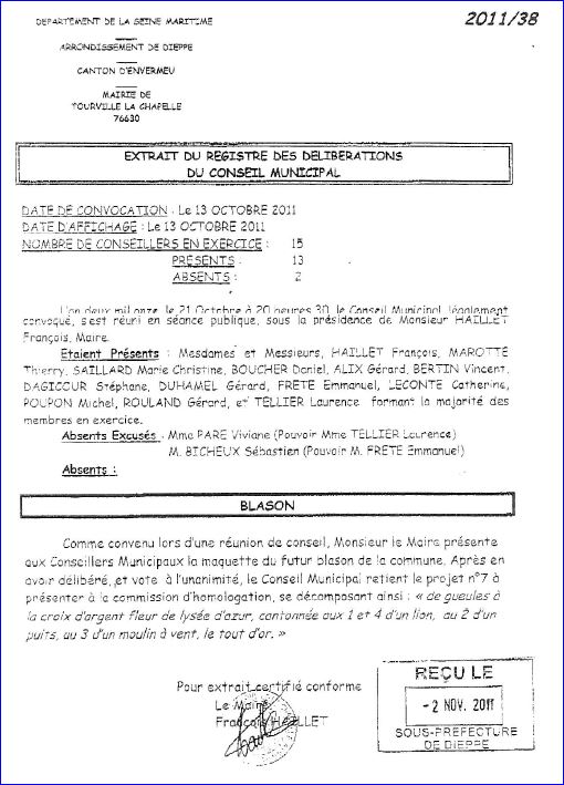 (2011) De gueules à la croix d'argent semée de fleurs de lis d'azur, cantonnée aux 1er et 4e d'un lion, au 2e d'un puits du lieu et au 3e d'un moulin à vent, le tout d'or.