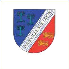 Taillé: au 1er d'azur à trois pommiers fruités d'or ordonnés en orle, au 2e de gueules à deux léopards d'or rangés en barre; à la barre d'argent, chargée de l'inscription « TOURVILLE SUR ODON » de sable et brochant sur six filets ondés en barre d'azur, ladite barre brochant sur la partition.