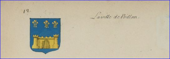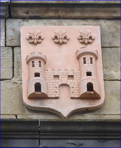 D'azur au château d'or, la tour senestre plus haute que la dextre, le tout maçonné de sable, surmonté de trois fleurs de lis d'or rangées en chef.
