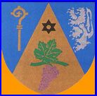 D'or à la grappe de raisin de pourpre tigée et feuillée de sinople, surmontée d'une molette d'éperon de sable; chapé d'azur chargé à dextre d'une crosse d'or et à senestre d'un lion d'argent.