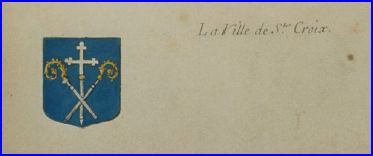 D'azur à la croix haussée, tréflée, au pied fiché d'argent, à deux crosses affrontées d'or, fûtées d'argent, passées en sautoir et brochant sur le tout.