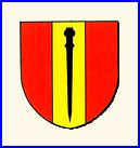 De gueules au pal d'or chargé d'un bourdon de pèlerin de sable.