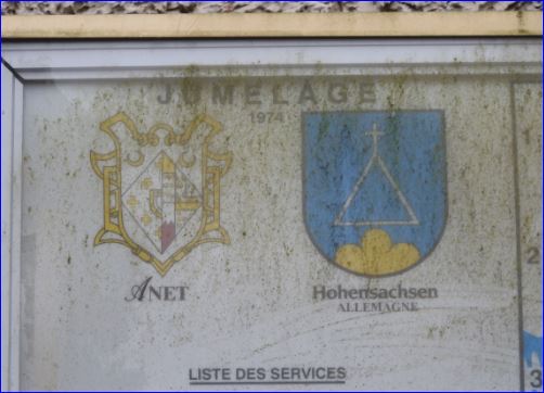 Parti: au 1er mi-parti d'or à l'écusson d'argent bordé d'azur et à la bordure d'azur chargée de huit croisettes d'or, au 2e écartelé aux I et IV d'azur à six besants d'argent et au chef d'or, au II d'azur semé de fleurs de lis d'or et au franc quartier senestre d'argent chargé de trois croissants mal-ordonnés de gueules, au III d'argent à deux pointes de sable mouvant de la pointe.