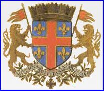 (v. 1300, 1960) D'azur à la croix de gueules, bordée d'or, cantonnée de quatre fleurs de lis du même.