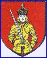 De gueules à saint Nabor à mi-corps de carnation, armé de toutes pièces d'or, tenant dans sa dextre une épée haute d'argent, garnie d'or et posée en bande, à la couronne fermée d'or sommée dune croisette potencée du même.