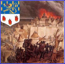 (1696) Coupé: au 1er d'azur semé de billettes d'or, au lion issant du même, armé et lampassé de gueules, au 2e d'argent à trois flammes de gueules.