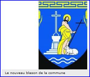 (2012) D'azur à saint Jean-Baptiste de carnation, contourné et regardant, nimbé et vêtu d'or, chevelé et barbé de sable, tenant de sa senestre une croix à longue hampe du même, et de sa dextre désignant un agneau d'argent couché à ses pieds à senestre, brochant sur un calvaire du lieu du même ajouré du champ à dextre, accosté en chef de deux épis de blé tigés et feuillés d'or, et soutenu d'une jumelle ondée d'argent; au comble d'azur chargé d'une double burelle potencée et contre-potencée d'or.