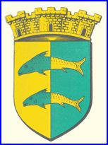 (1970) Parti d'or et de sinople, à deux poissons nageant l'un au dessus de l'autre, de l'un en l'autre.