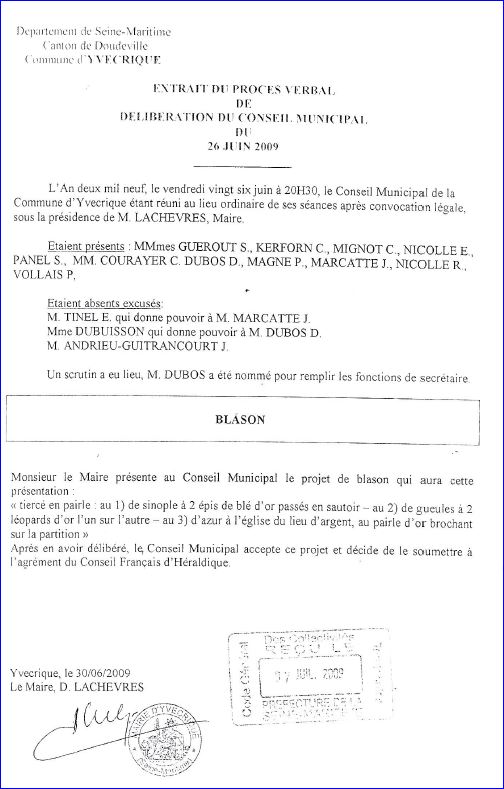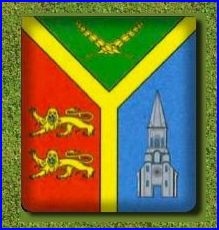 (2009) Tiercé en pairle: au 1er de sinople à deux épis de blé d'or passés en sautoir, au 2e de gueules à deux léopards d'or l'un au-dessus l'autre, au 3e d'azur à l'église du lieu d'argent; au filet en pairle d'or brochant sur la partition.
