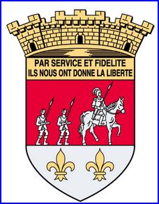 De gueules au cavalier suivi de deux hommes à pied, les trois contournés et armés d'une lance, le tout d'argent posé sur une champagne du même chargée de deux fleurs de lis d'or; au comble d'or chargé de la devise « PAR SERVICE ET FIDELITE ILS NOUS ONT DONNE LA LIBERTE » en lettres capitales de sables et sur deux lignes.