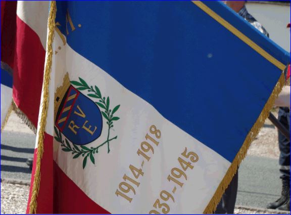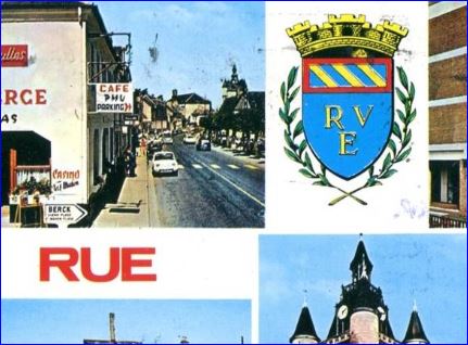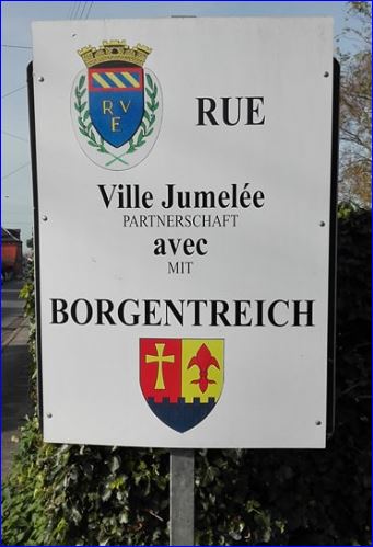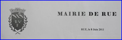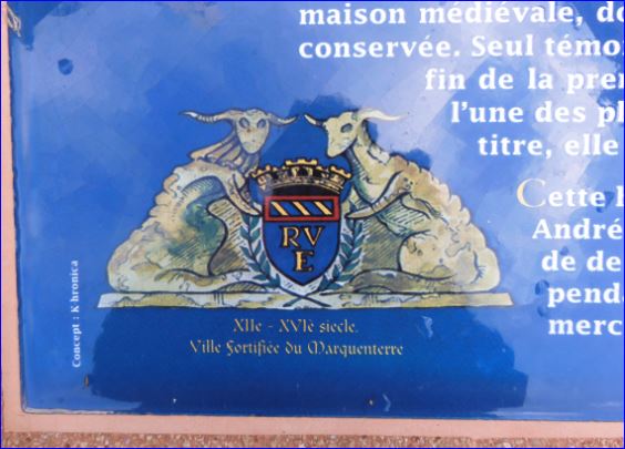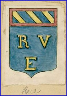 D'azur aux trois lettres capitales R, U et E d'or, ordonnées 2 et 1; au chef d'azur à trois bandes d'or et à la bordure de gueules.