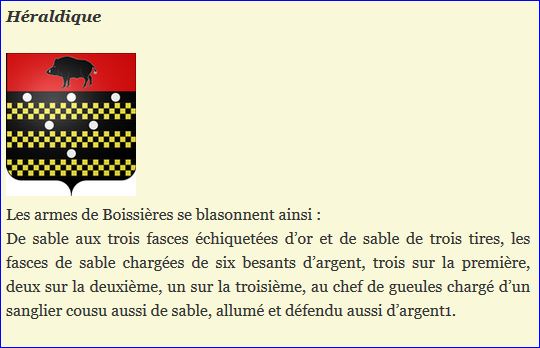 De sable à trois fasces échiquetées d'or et de sable de trois tires, les fasces de sable chargées de six besants d'argent, trois sur la 1ère, deux sur la 2e, un sur la 3e; au chef de gueules chargé d'un sanglier de sable, allumé et défendu d'argent.