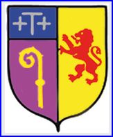Parti: au 1er de pourpre à la crosse d'or, au chef d'azur chargé d'une potence accostée de deux croisettes, le tout d'argent; au 2e d'or au lion à la queue léopardée de gueules.