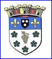 (1974) D'argent à la grappe de raisin tigée d'or accompagnée de cinq quintefeuilles de sinople 2, 2 et 1; au chef d'azur chargé d'un écusson de sable à trois besants d'argent et accosté de deux fleurs de lis d'or.