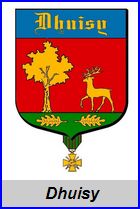 (2011) De gueules à l'arbre d'or senestré d'un cerf passant du même, le tout sur une terrasse cousue de sinople chargée de deux feuilles de chêne d'or appointées en fasce par les pétioles; au chef cousu d'azur chargé de l'inscription «Dhuisy» en lettres gothiques d'or.