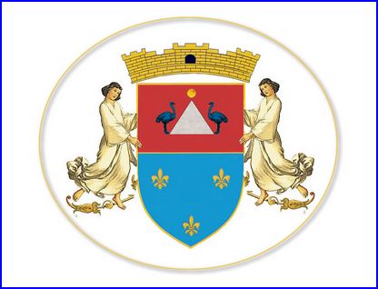 Coupé: au 1er de gueules au triangle d'argent surmonté d'un besant d'or et accosté de deux autruches affrontées au naturel, 2e d'azur à trois fleurs de lis d'or.