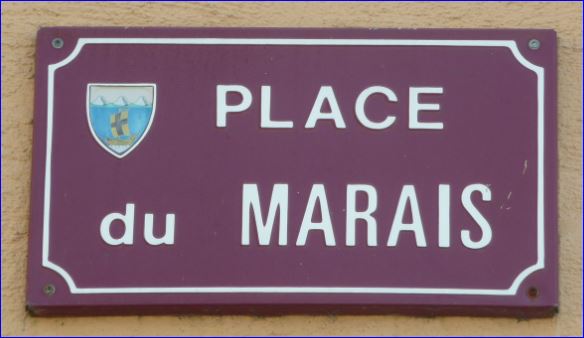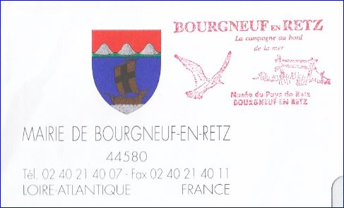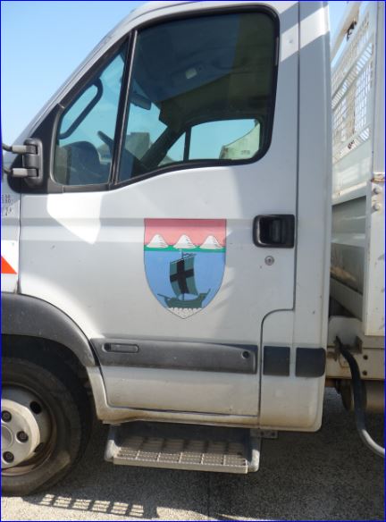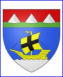 (1971) D'azur à la nef équipée et habillée d'or, la voile chargée d'une croix de sable, voguant sur une mer d'argent; au chef cousu de gueules chargé de trois meulons de sel d'argent terrassés de sinople.