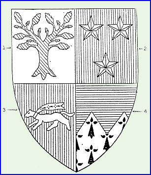 Écartelé: au 1er d'argent au chêne de sinople englanté de gueules, au 2e de gueules à trois étoiles d'argent, au 3e de gueules à l'hermine passante d'argent, colletée du même et cravatée d'hermine, au 4e coupé émanché d'azur et d'hermines.