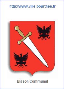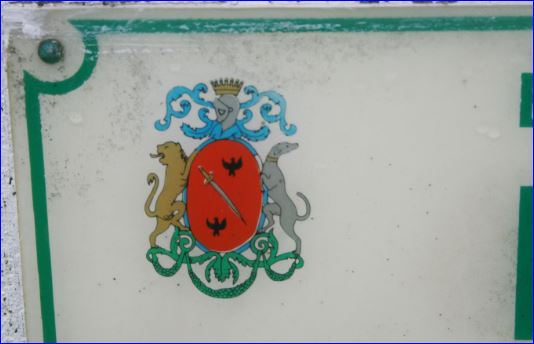 De gueules à l'épée basse d'argent, garnie d'or, posée en bande et accompagnée de deux aigles de sable.