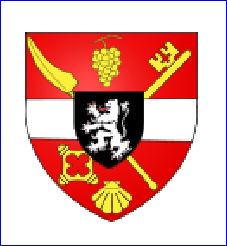De gueules à la fasce d'argent surmontée d'une grappe de raisin et soutenue d'une coquille, le tout d'or, à la clef posée en barre passée en sautoir avec une faux, le tout du même brochant; sur le tout de sable au lion d'argent, armé et lampassé de gueules.