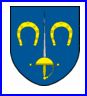D'azur à l'épée d'argent, garnie d'or et accostée de deux fers à cheval du même, percés du champ.
