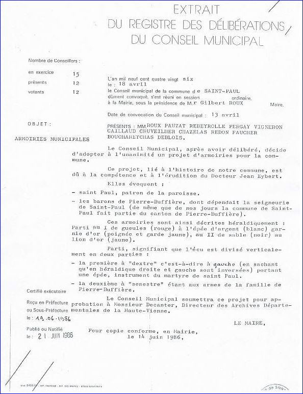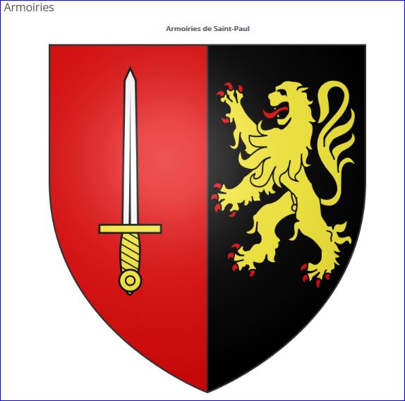 (1986) Parti: au 1er de gueules à l'épée haute d'argent, garnie d'or, au 2e de sable au lion d'or, armé et lampassé de gueules.