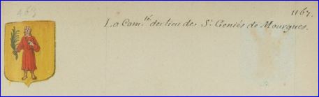 D'or à saint Geniès martyr de carnation, vêtu de gueules, tenant dans sa main une palme de sinople; au franc-quartier d'azur, chargé d'une crosse d'argent accostée des lettres capitales d'or S à dextre et G à senestre.