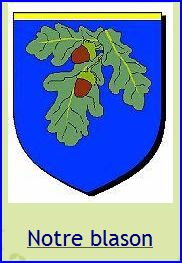 D'azur à trois feuilles de chêne versées de sinople, la nervure principale d'or, réunies par leurs pétioles, la première posée en fasce, la deuxième en pal et la troisième en bande, chargées de deux glands de gueules à la cupule d'or, posés en barre l'un au-dessus de l'autre; au chef rompu d'or.
