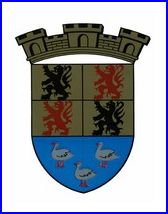 Coupé: au 1er écartelé aux I et IV d'or au lion de sable, aux II et III d'or au lion de gueules, au 2e d'azur à trois canettes d'argent becquées et membrées de gueules.