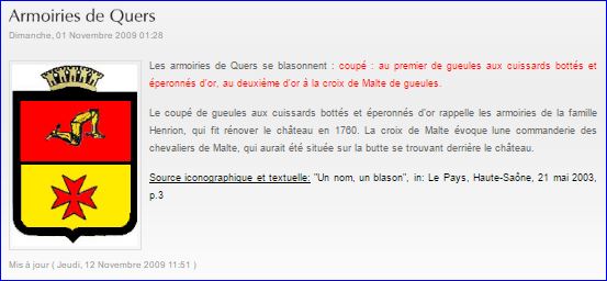 Coupé: au 1er de gueules aux cuissards éperonnés d'or, au 2e d'or à la croix de Malte de gueules.