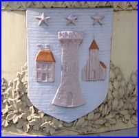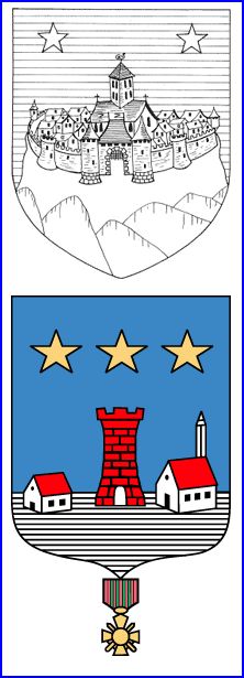 D'azur à la tour d'argent, ajourée et maçonnée de sable, adextrée d'une maison à deux panonceaux et senestrée d'une église, la maison et l'église, d'argent, ouvertes et ajourées de sable, surmontée de trois étoiles d'argent rangées en fasce.