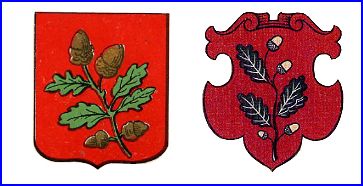 (1890) De gueules à la branche de chêne de sinople englantée de quatre pièces d'or.