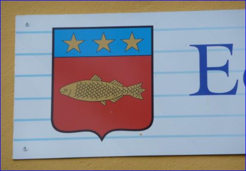 De gueules au poisson d'or posé en fasce; au chef cousu d'azur chargé de trois étoiles d'or.