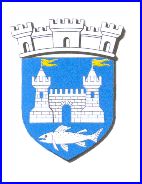 (1978) D'azur au château de deux tours couvertes d'argent, girouettées d'or, ajouré et maçonné de sable, soutenu d'un saumon d'argent.