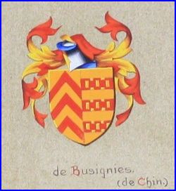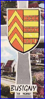 Parti: au 1er d'or à trois chevrons de gueules accompagnés en pointe de la croix de guerre 1939-1945, au 2e d'or à trois fasces de gueules semées de billettes d'or.