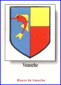 Parti: au 1er d'azur au dauphin de gueules, barbé, crêté, lorré, oreillé et peautré d'or (d'argent), au 2e de gueules au chef d'or.