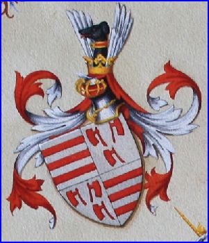 Écartelé: aux 1er et 4e d'argent à trois fasces de gueules,aux 2e et 3e d'argent à trois doloires de gueules; à la cloche d'azur brochant sur la partition en abîme.
