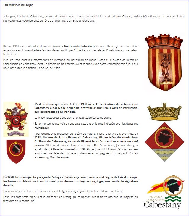 (1988) Écu en losange. De gueules à la tête de Maure de sable, tortillée d'argent et du champ, enfermée dans un ouroboros [serpent décrivant un cercle] contourné d'or; à la champagne d'argent chargée de deux burelles ondées de sinople.