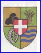 (1986) Écartelé: au 1er d'or au rocher isolé de trois cailloux de sable, au 2e de sinople à la gerbe de blé d'or, au 3e de sinople à la roue de moulin d'argent posée en perspective, au 4e d'or à trois fasces ondées d'azur; sur le tout, de gueules à la croix d'argent.