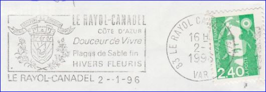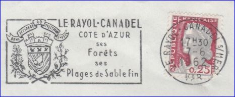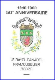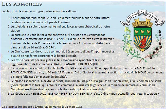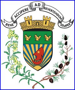 (1956) D'azur au soleil d'or mouvant de la pointe, à douze rayons convergeant vers la pointe et s'élargissant vers le chef, au croissant de gueules brochant sur les rayons, figurant la coque d'une nef contournée avec une voile du même chargée d'une étoile d'or; au chef cousu de sinople chargé de trois écureuils accroupis d'or et tenant une pomme de pin du même.