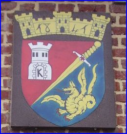 Taillé: au 1er de gueules à la tour d'argent maçonnée de sable, la porte chargée de la lettre capitale K du même, au 2e d'azur au dragon d'or; à l'épée basse d'or, la garde d'argent chargée d'une croisette ancrée de gueules, posée en barre et brochant sur le taillé.