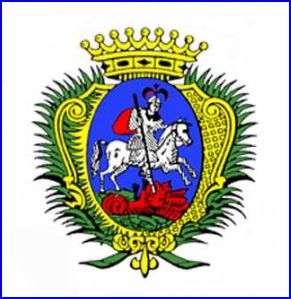 D'azur à saint Georges à cheval contourné d'argent, la cape de gueules et le casque sommé de trois plumes du même, sur une terrasse de sinople, terrassant un dragon couché de gueules brochant sur le tout.
