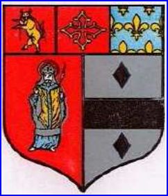 Parti: au 1er de gueules l'évêque d'argent, vêtu d'or et d'azur, nimbé d'or et tenant dans sa senestre une palme du même, au 2e d'argent à la fasce de sable, accompagné de deux losanges du même, un en chef et un en pointe; le tout sommé d'un chef tiercé en pal au I de gueules au boeuf furieux d'or, au II de gueules à la croix cléchée, vidée et pommetée de douze pièces d'or et au III d'azur semé de fleurs de lis d'or.