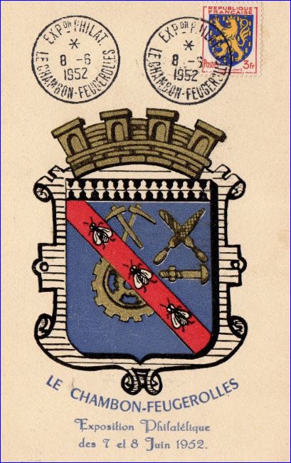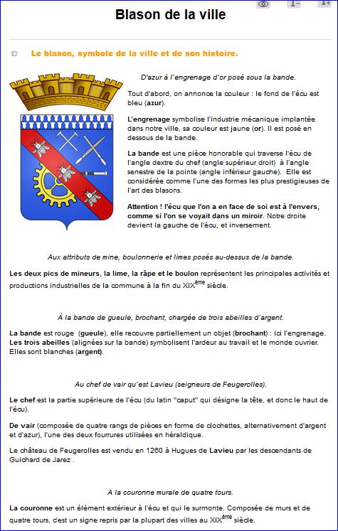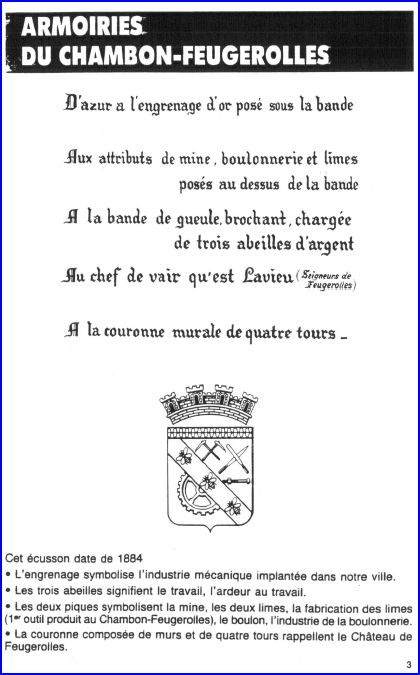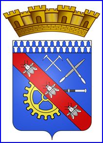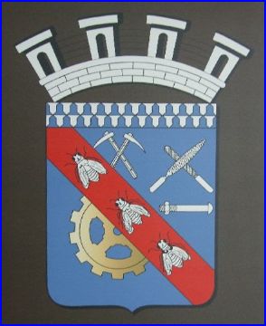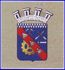 (ap. 1884) D'azur à la bande cousue de gueules, chargée de trois abeilles d'argent dans le sens de la bande, accompagnée, en chef, de deux pics de mineurs passés en sautoir senestrés d'une lime et d'une râpe passées en sautoir et soutenues d'un boulon à tête ronde d'argent posé en fasce, l'écrou à dextre, le tout d'argent, et, en pointe, d'une roue crantée à quatre rais en sautoir d'or au mouvant à demi de la bande; au comble de vair de deux tires.