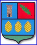 Coupé: au 1er parti au I d'azur à la tour d'argent ouverte et maçonnée de sable, au II de gueules à la feuille de chêne de sinople posée en bande, au 2e d'azur à trois pommes de pins d'or rangées en fasce; le tout posé sur une plaine de sinople.