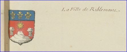 De gueules, à la montagne d'argent, surmontée d'un soleil d'or et accostée de deux gerbes de blé du même; au chef cousu d'azur, chargé de trois fleurs de lis d'or.