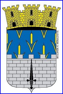 (2003) D'azur semé de joncs d'or, coupé d'un mur crénelé d'argent, mouvant de la pointe, maçonné de sable et chargé d'une épée haute de sable.